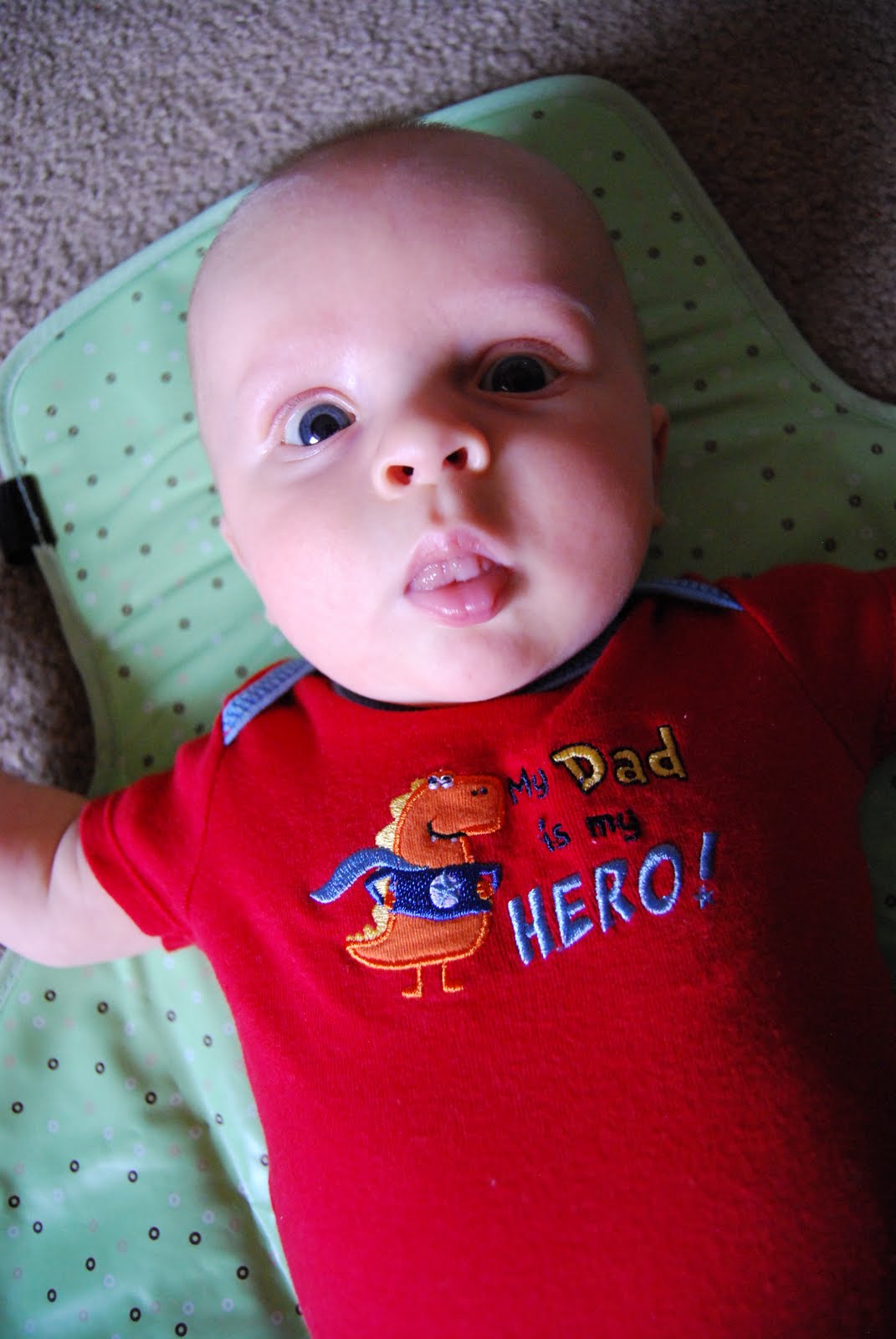 At three months Micah is around 14 pounds. He really knows how to pack it on. Now he is really talking, and enjoys talking with us. Toys catch his interest more. He attempts to grab them and is successful sometimes. Tummy time is starting to be more enjoyable for him. The control he has over his head has greatly improved. He has "seen" his hands. Nap time is going great, we are just working on extending nighttime. I'm sure there are other things he is doing now that I am missing.